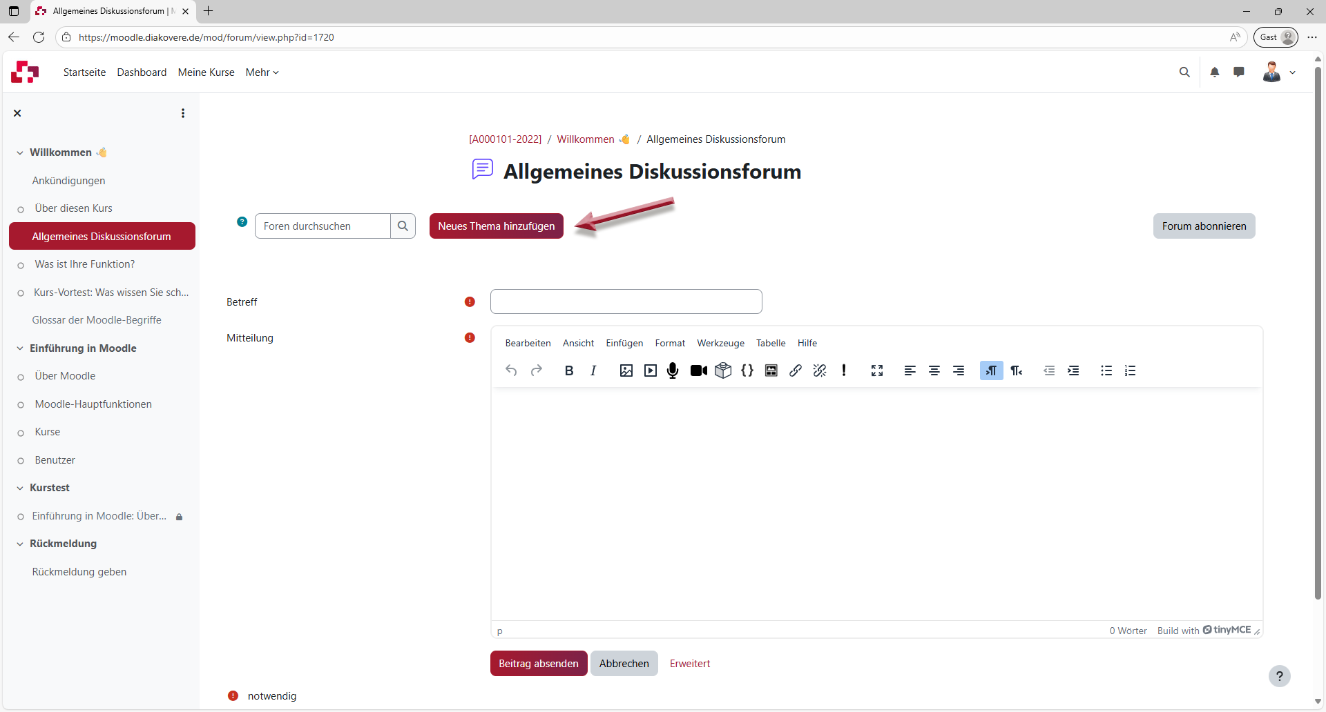Es gibt in Moodle unterschiedliche Arten von Foren. In manchen Foren darf man als Teilnehmer/in nur lesen und Trainer/innen dürfen Beiträge posten (z. B. „Ankündigungen in Kursen“). In manchen Foren darf man nur ein Thema posten („Frage-Antwort-Foren“).