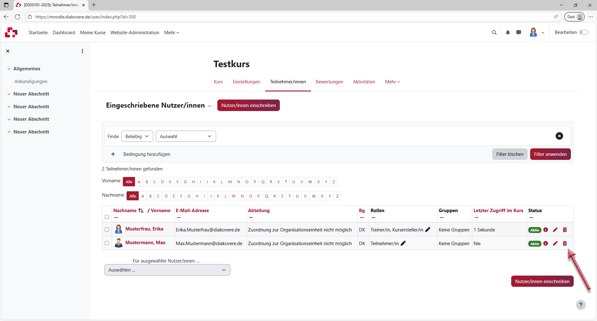Klicken Sie auf das Papierkorb-Symbol des Kursteilnehmers, den Sie vom Kurs abmelden und er wird nach einer Bestätigungsabfrage von diesem Kurs abgemeldet.
