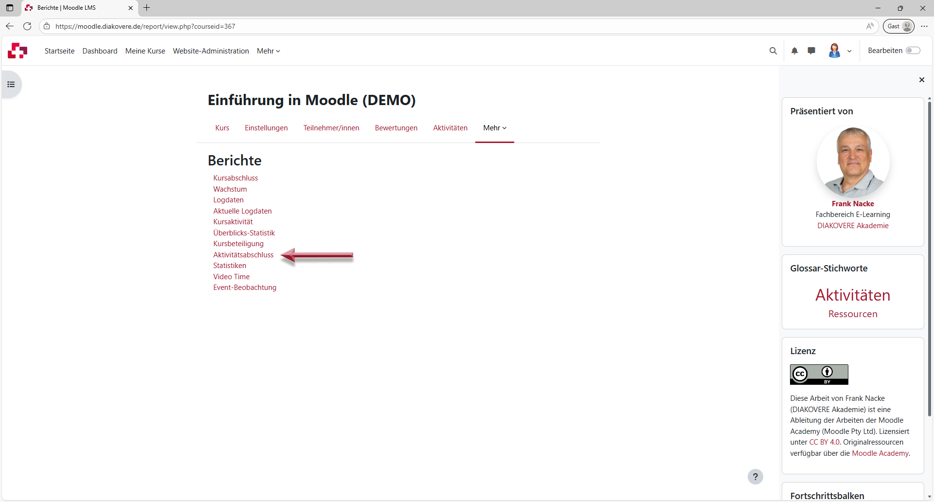 Im Aktivitätsabschlussbericht sehen Sie alle Aktivitätsabschlüsse aller Teilnehmer/innen. Hier können Sie den jeweiligen Status überschreiben, der graue Kasten ist dann rot hinterlegt und beim darüberfahren erhält man die Information, wer und wann der Status überschrieben wurde.