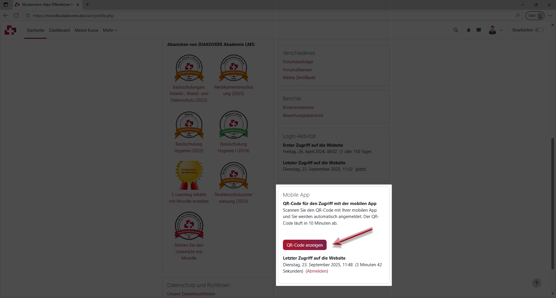 klicken Sie auf QR-Code scannen. Dazu gehen Sie in Ihrem Benutzermenü (rechts oben) > Profil auf QR-Code anzeigen und scannen den QR-Code ein.